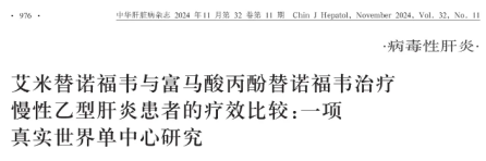 4.陈如悦,吕雪艳,黄硕,等. 艾米替诺福韦与富马酸丙酚替诺福韦治疗慢性乙型肝炎患者的疗效比较:一项真实世界单中心研究[J]. 中华肝脏病杂志,2024,32(11):976-983.